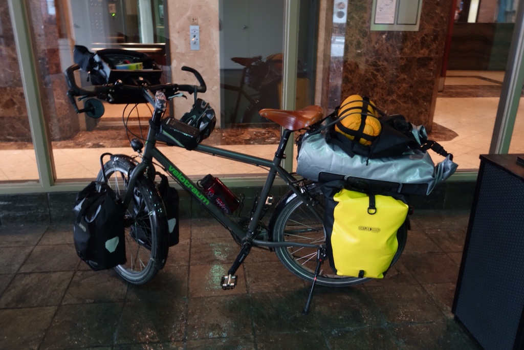 Ich hab das Hotel, meinen letzen Zufluchtsort in der zivilisierten Welt, gegen 11:30 Uhr verlassen und mein Fahrrad beladen. Gefühlt wiegt das ganze Gepäck wohl um die 100 Kilo. Aber Spaß beiseite, das Systemspeicher, Fahrrad, Gepäck und Fahrer dürfte wohl so locker bei 140 kg liegen. Und das will ich durch die Rockies treten. Na Prost.