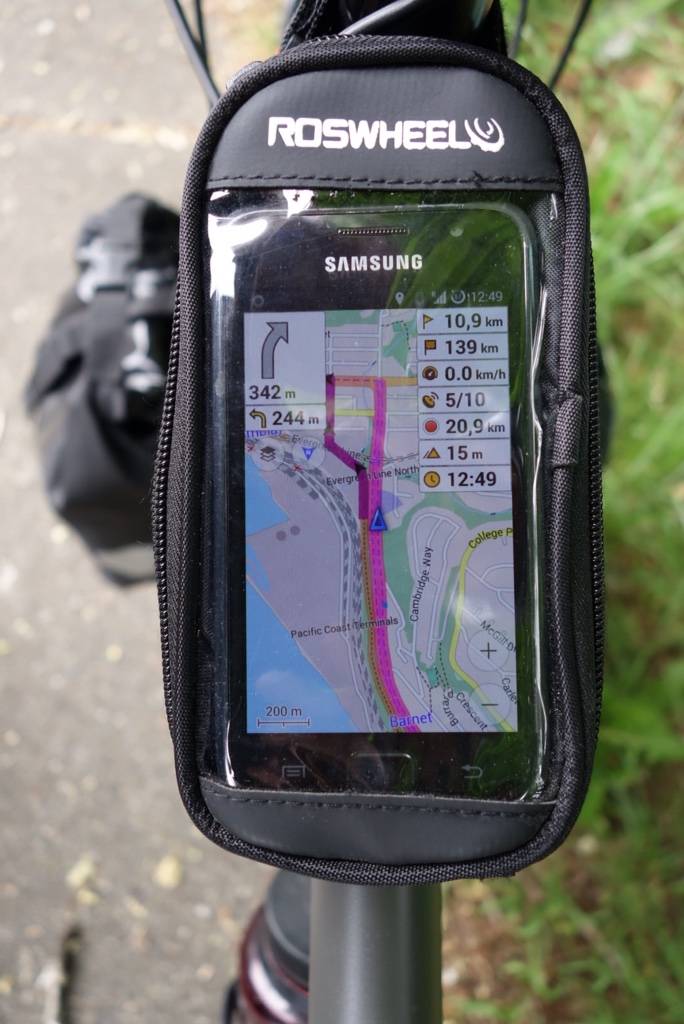 Noch im Hotel habe ich mir die Route bis zu meinem ersten Ziel Hope, das ich, wenn alles nach Plan klappt, in zwei oder drei Tagen erreichen werde, schon mal ins Handy eingegeben. An dieser Stelle möchte ich mal ein Loblied auf OsmAnd singen. Das Ding ich echt der Hammer. Und seit dem letzten Update sogar irgendwie bedienbar. Noch zuhause habe ich auf die SD-Karte alle Vektorkarten der eventuell in Frage kommenden Staaten Kanadas und der USA geladen. Jetzt habe ich hier – offline – sämtliche Stadt und sonstwas Pläne verfügbar. Man kann alle Straßen des Landes – offline – suchen oder auf die Karte tippen und sagen „Da will ich hin!“, schon springt das Navi an und rechnet einem die Route aus. Für Auto, Fahrrad oder zu Fuß. Ich bin begeistert. Allen Beteiligten Open Street Mapern und OsmAnd Entwicklern sei Dank. Erinnert mich dran, mir die Vollversion von dem Teil zu kaufen. Das kann zwar nicht mehr, aber das Projekt muss unterstütz werden.
