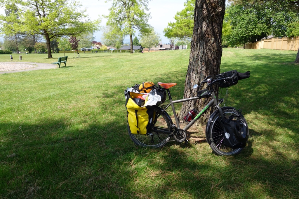 Dann hab ich in einem kleinen Park eine kurze Pause gemacht und beschlossen, dass es an der Zeit wäre den Fahrradtag zu beenden. Das linke Knie hat leicht geautscht und der Hintern wollte auch nicht mehr. Leider hatte ich zu dem Zeitpunkt erst 45 Kilometer von 160 bis zum Ziel geschafft. Egal. Ich bin nicht auf der Flucht.