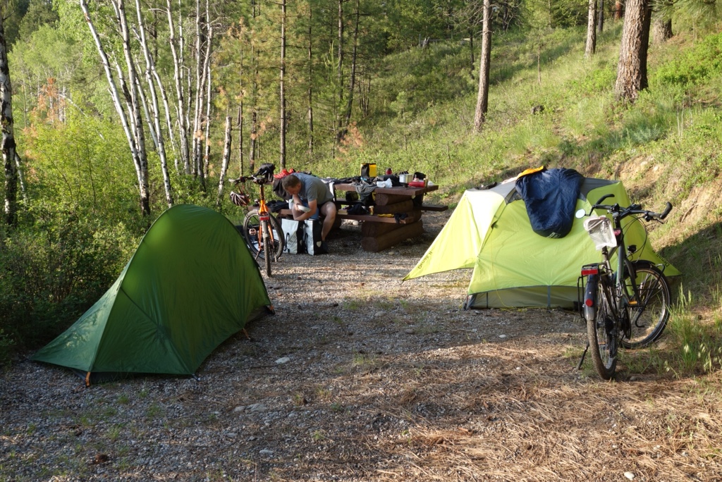Aus einer geplanten 45 km – wir fangen mal langsam an – Tour, wurde eine 85 km Tagesetappe mit netter Steigung am Ende. Es gab gleich keinen Campground, ich bin aber froh deswegen, sonst hätte ich mir anhören müssen, warum ich immer 8 Liter Wasser durch die Gegend fahre, jetzt sind wir glücklich über Abendessen, Kaffee am Morgen und Trinkwasser. Und der Platz am Ende ist einfach der Hammer.