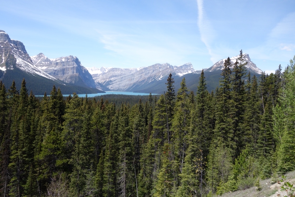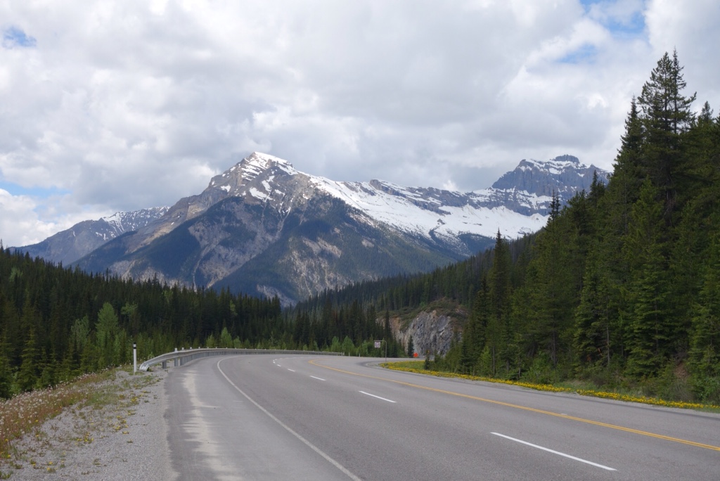Jedenfalls sind wir jetzt in der Wildniss angekommen. Aus die nächsten 250 km gibt es, bis auf einen Ort namens Saskatchewan Crossing, einer etwas größeren Tankstelle mit Supermarkt und Motel, nichts. Keinen Ort, keine Ranch, keine Alm oder Hütte, nur ab und zu einen Campground mit Plumsklo und einem Hahn mit Trinkwasser. Davon haben aber die meisten um diese Jahreszeit noch geschlossen. Die für uns wichtigen Campgrounds auf dem Weg nach Jasper sind auch erst seit Anfang Juni geöffnet.