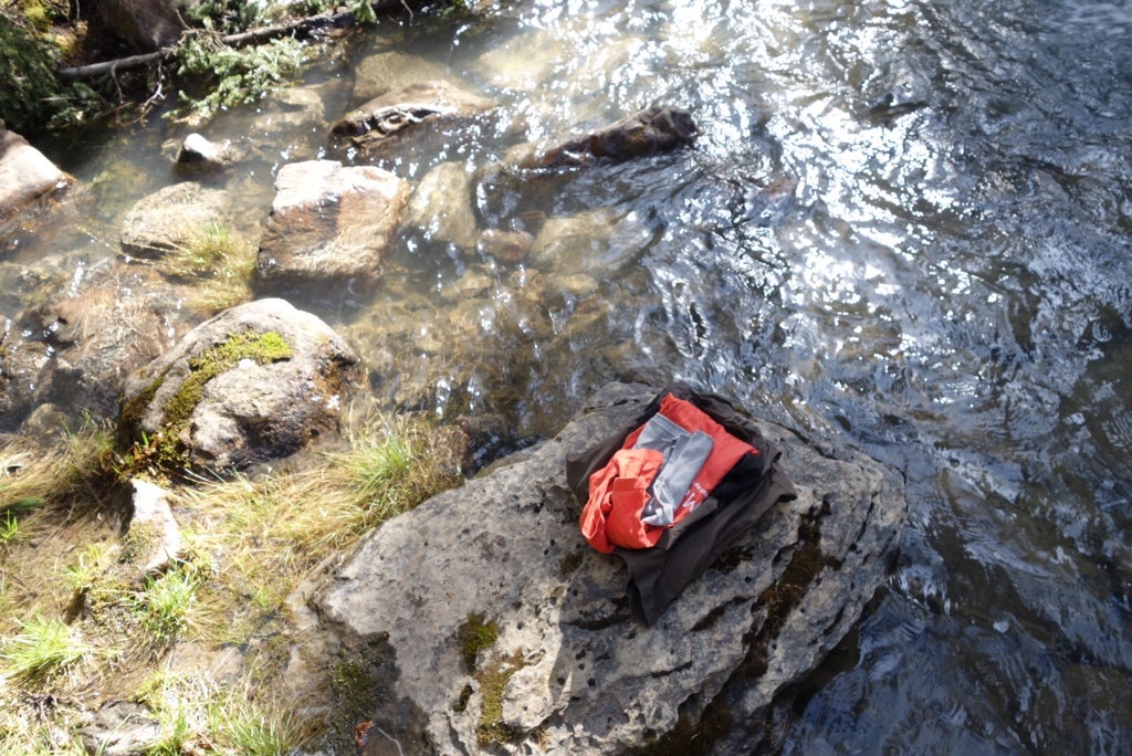 Plötzlich laufen 5-6 andere Camper in Richtung Fluß. Bärenalarm! Eine Bärenmutter mit ihrem Jungen ist auf dem Campground. Keine 40 Meter von unserem Zelt entfernt suchen die beiden seelenruhig zwischen den Büschen nach etwas essbarem.